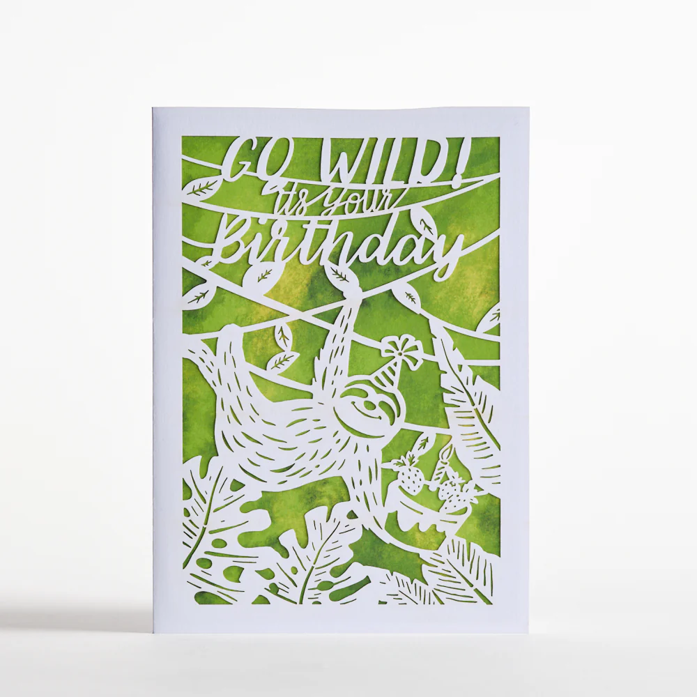 It's time for your loved one to get loose and celebrate another year of life, or at least that's what the sloth on the cover of this birthday card encourages. The usually lethargic creature sports a party hat for the occasion as it suspends from a tree branch against a green background. Highlighted in intricately laser-cut detail, the sloth holds a birthday treat in its hand, complete with icing, candles, and strawberry toppings.